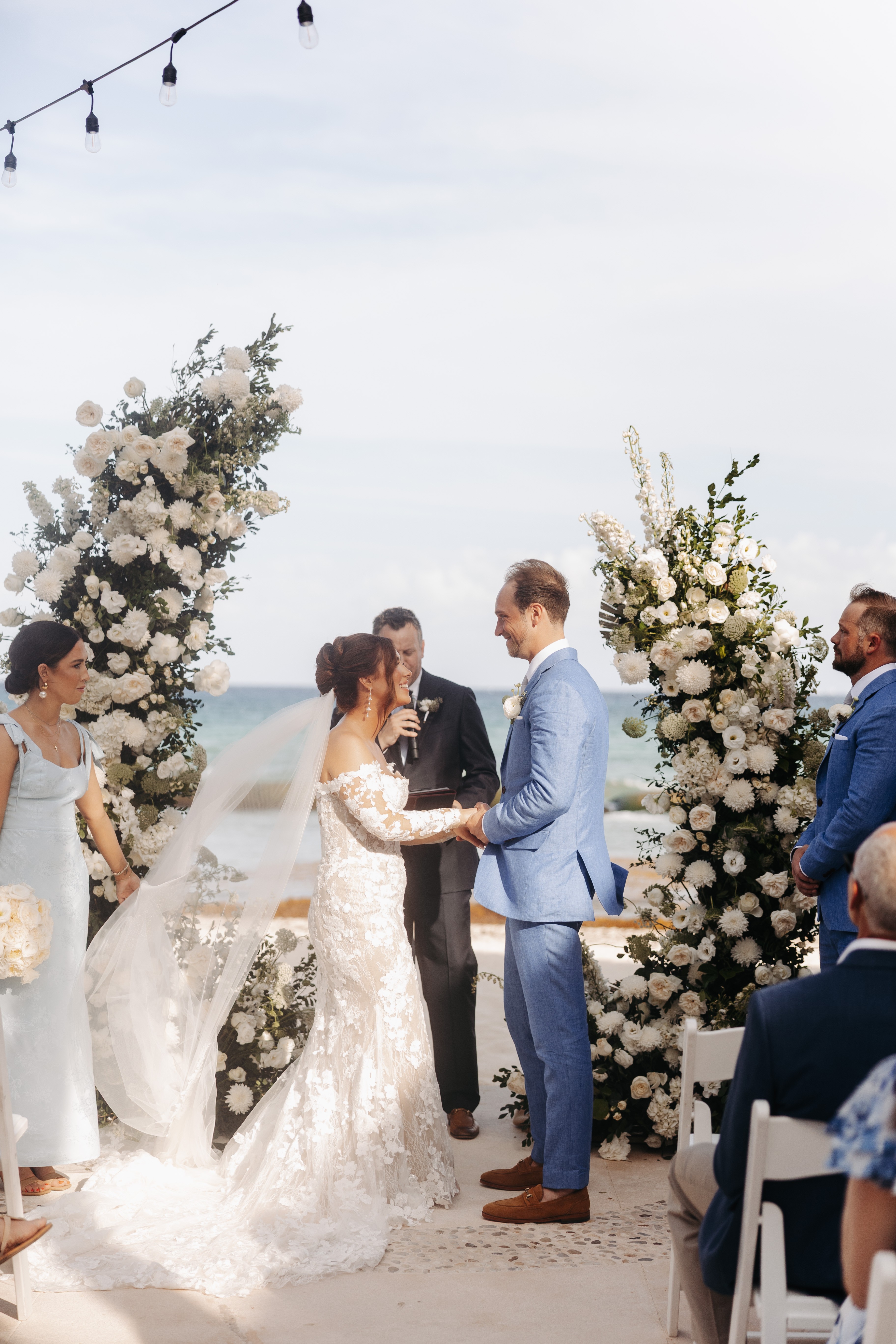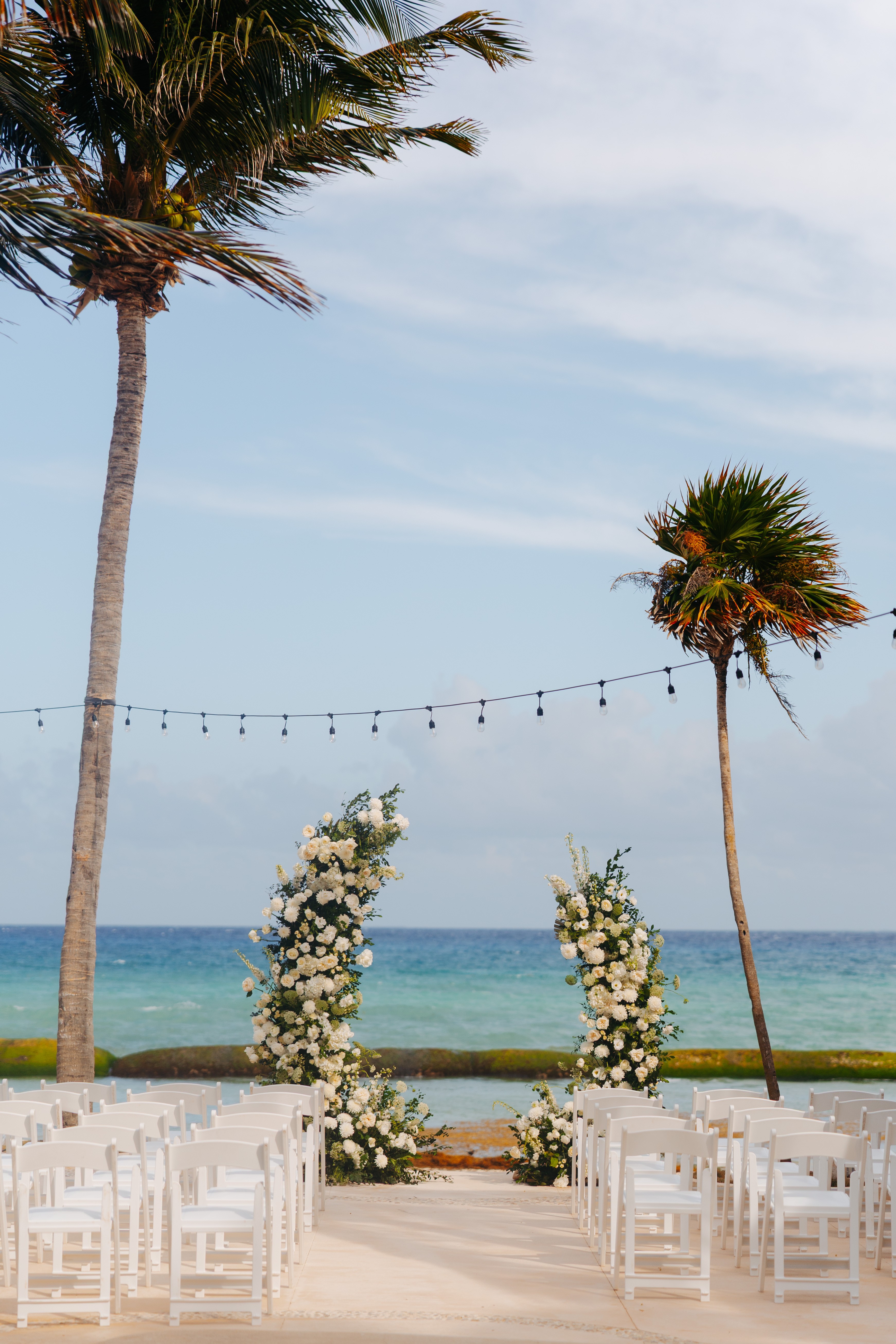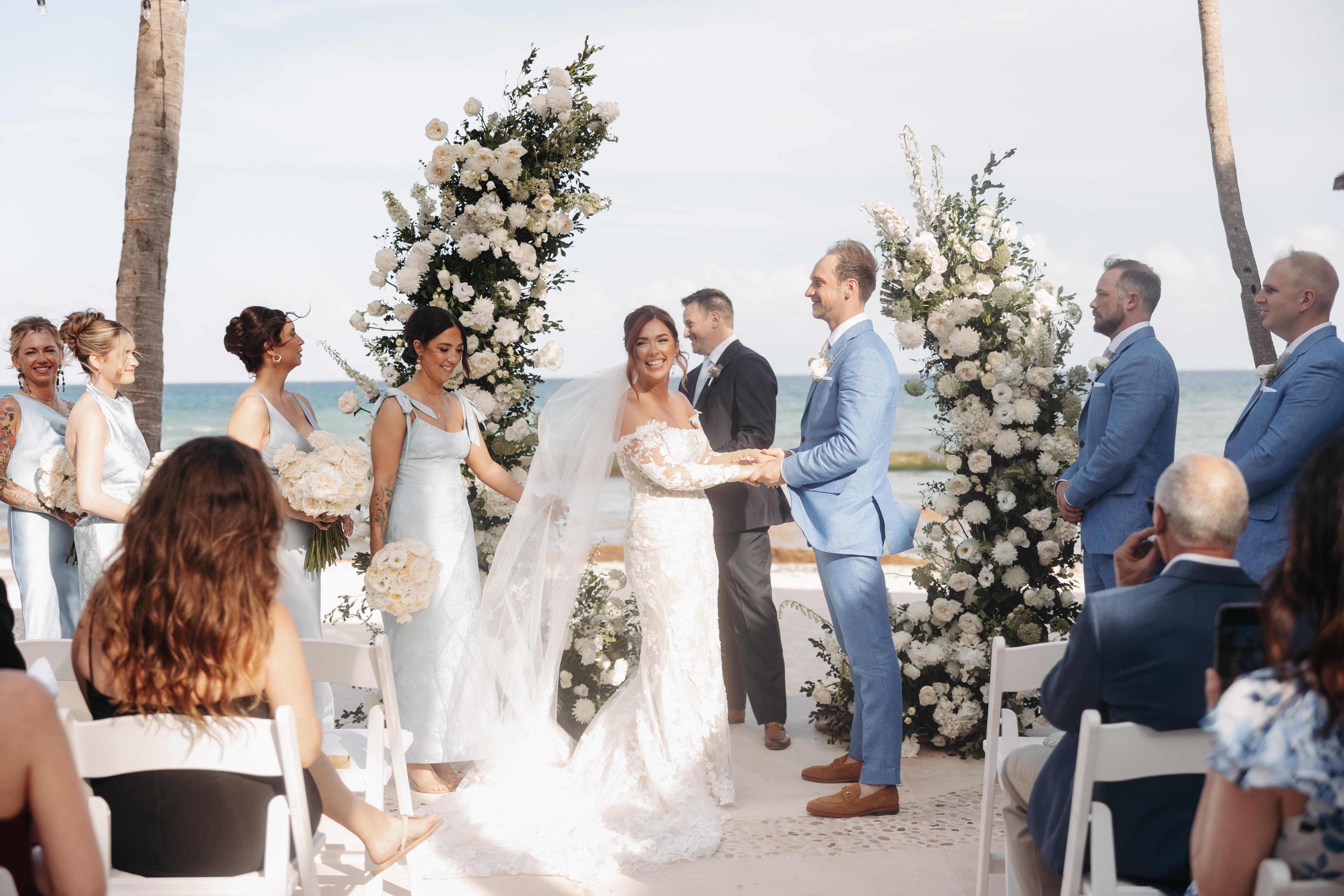 This destination wedding at a Viceroy resort in Mexico features a coastal setting with ocean views, open-air ceremony space, and a modern resort backdrop. The location provides a mix of beachfront and architectural elements that support a full day of wedding coverage in one place.